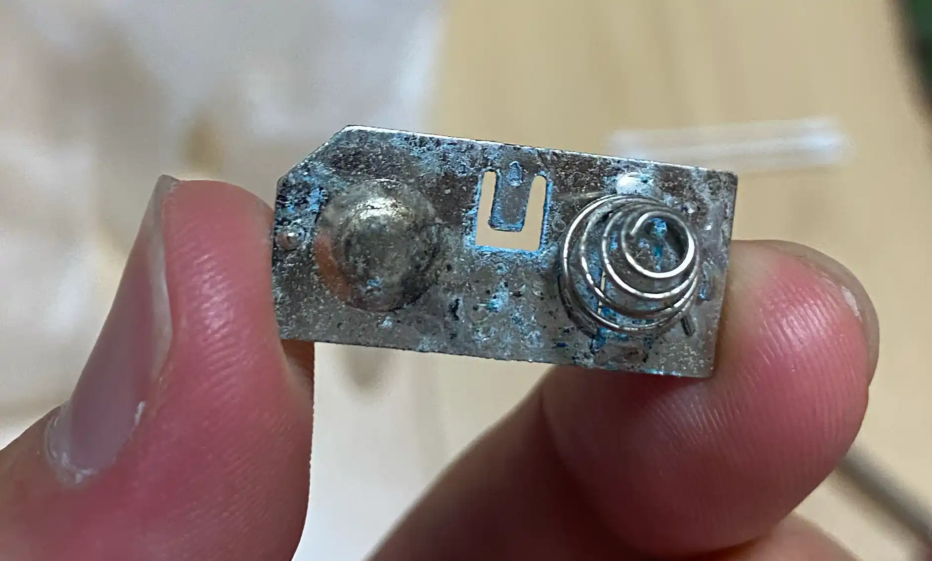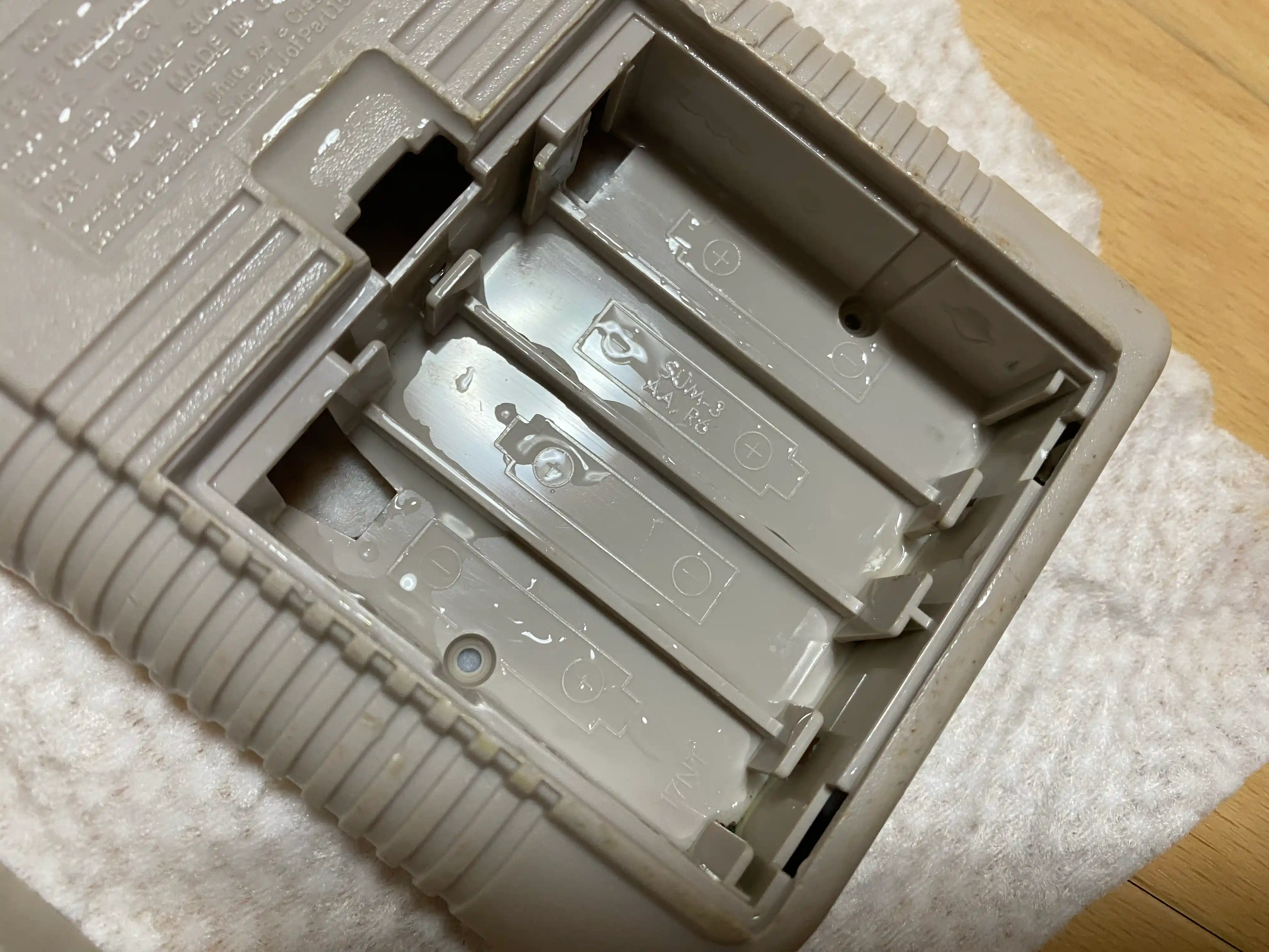 液漏れした粉はアルカリ成分が多いので、お酢につけることで除去できることがあるようです。ただ、今回は少し綿棒で触ってしまった(無知)際に、端子のメッキが剥がれてしまいました。そのため、買い換えです。要するに適当な電池端子にリプレースするわけです。